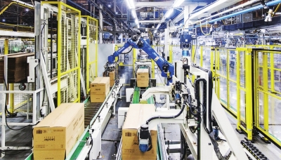 在武汉海尔工厂的全自动空调内机套箱包装线上,一排新投用的机械臂运转灵活,仅需数秒即可精准完成取箱、套箱与打包等系列工序。包装完毕的空调内机随传送带平稳下线,整体流程高效顺畅。