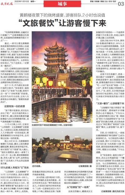 晚上6时30分,当黄鹤楼的璀璨灯光亮起,露台上国风舞者翩跹起舞,餐桌边食客举起手机,将对面的“天下绝景”收入镜头。“国庆长假期间,最长一桌等了2小时,可一走上楼,看到黄鹤楼夜景,所有人都‘哇’出声,说再等也值!”门店负责人于先生的话里满是自豪。