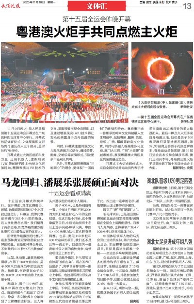 11月9日晚,中华人民共和国第十五届运动会开幕式在广东奥林匹克体育中心举行。开幕式包括体育仪式、文体展演和火炬场内传递及点火三个部分,总时长约75分钟。