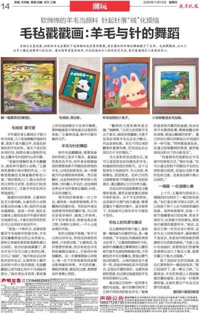 “那是一个转折点,我看到那幅用羊毛毡制作的星空图,羊毛层层叠叠营造出的云朵和星光,那种立体感和柔和度是颜料难以达到的。我当时就被震撼了,原来羊毛不仅可以做立体的玩偶,还可以‘画画’。”她开始尝试这种新的创作形式,从简单的小幅作品到如今的大型风景画,毛毡戳戳画已成为她生活中不可或缺的部分。“每次朋友来我家,看到墙上的毛毡画都忍不住伸手触摸,那种触感是平面绘画无法提供的体验。”王嘉琦说道,眼中闪着自豪的光芒。