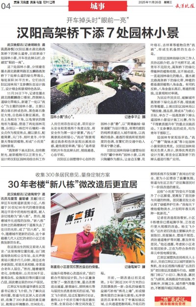 江岸区车站街道华清社区党委书记杨文飞介绍,为了解决这些问题,街道与社区深入走访调研,收集了300多条居民意见建议,梳理出环境整治、空间优化、设施升级等核心改造诉求。“我们联合市规划设计院,为小区量身定制了一套改造方案,重点改善进出通道、景观绿化、照明亮化等与居民生活息息相关的区域。”杨文飞介绍说,经过反复研讨论证,最终从8个初步方案中选定最优方案,全面启动小微空间改造工程。