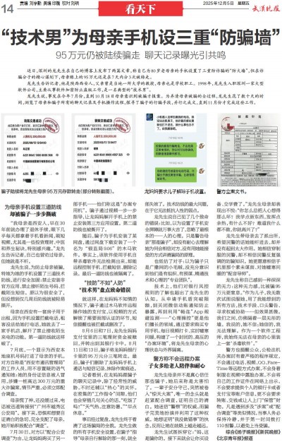 龙先生说自己犯了几个致命的错误:比如,以为设置了手机安全屏障就万事大吉了,忽略了最根本的——人的心理。只是警告母亲“那是骗子”,却没有耐心去理解她为何会相信对方,没有用她能接受的方式讲清骗局的原理。