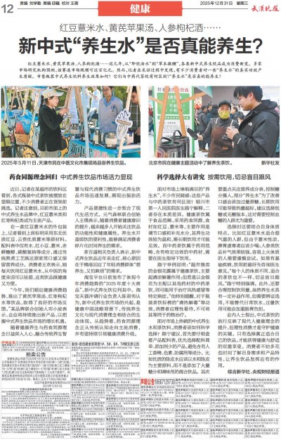 选择时还要结合自身体质特点。比如红豆薏米水适合湿气重的人群,但由于薏米性凉,脾胃虚寒者应该少喝;人参类饮品补气效果较强,容易上火体质的人需要谨慎尝试。如果有基础疾病,饮用前最好先咨询医生意见。“每个人的体质不同,适合的茶饮也不一样,切忌盲目跟风。”路宁特别强调。此外,还要合理控制饮用量,虽然养生水具有一定补益作用,但需要辨证选用,不能替代日常饮水,过量饮用可能会加重肠胃负担。