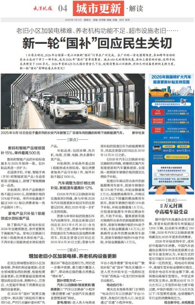 1日零点刚过,2026年全国第一笔以旧换新“国补”订单在广州完成。在广州的一家电器商场里,参加跨年活动的吴女士成功下单了一部手机,成为2026年“国补”首单消费者。减去650元的商场优惠,再加上国家的补贴,这部手机总共便宜了1000多元。2026年首批625亿元国补资金已下达,延续消费品以旧换新,并加大对设备更新的支持力度,新一轮“国补”有哪些看点和变化?