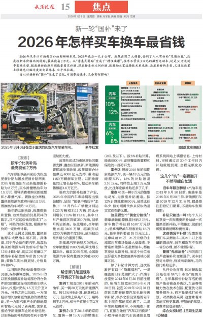 2026年汽车以旧换新国补细则姗姗来迟,2025年最后一天才公布。政策出现了大调整,告别了人人有份的“定额红包”,改成按新车价格比例补贴,最高能省2万元。从“普惠式补贴”变成了“精准滴灌”,往年不管买3万元的微型电动车,还是30万元的中高端车型,报废换新能源车都能拿固定补贴,现在按车价比例补贴,既鼓励大家选择技术更先进、品质更好的车型,又通过设置上限避免补贴过度流向豪华车,公平性拉满。