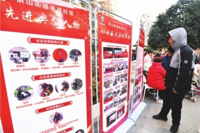 “好!好!好!”在社区治理成果展示区,再过一个月将满100岁的老人卢启发和爱人陈泽英拎着手提包伫立在展示牌前,仔细观看身边的服务“明星”,时不时上前半步弓着背端详图片文字。他指着“社区银发之星”霍凤英、陈泽英、卢启发、刘纯锡的照片和名字说,“夕阳红,爱学习”。