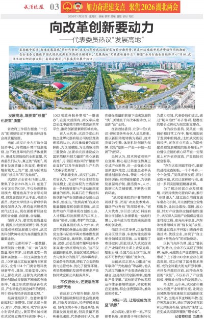 当前,武汉正全力打造全国经济中心,持续提升城市发展能级,这不仅是单纯的经济体量跃升,更是发展能级的全面重塑。代表委员们认为,真正的“高地”,既要有发展质量上的高度,也要有辐射能力上的广度,成为区域经济的“领头羊”和“发动机”。