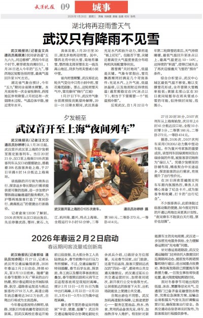 武汉晚报讯(记者郭佳 通讯员刘诗雨)1月27日,记者从武汉市交通运输局获悉,2026年春运2月2日启动,持续40天,至3月13日结束。随着“最长春节假期(9天)”带来的出行热潮,预计春运期间全市城际铁路、航空、道路客运发送与抵达旅客约2719万人次,高速公路车流总量将达3412万台次,自驾出行将成为主流选择。