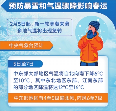 4日是中国传统二十四节气中的第一个节气——立春,全国大多地区气温继续升高,江南大部温暖如春。但自5日起,寒潮来袭,中东部将出现剧烈降温和雨雪天气,多个省份将降下大到暴雪或大暴雪,需防范雨雪天气和气温骤降对春运及能源供应带来影响。
