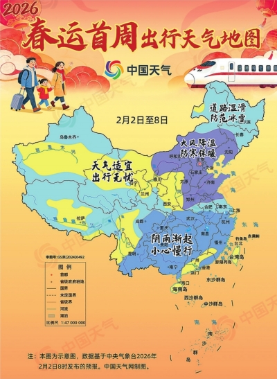 2月2日,为期40天的2026年春运拉开帷幕。根据预测,今年春运期间全社会跨区域人员流动量将达95亿人次,将再创历史新高。返乡途中天气如何?中国天气网推出全国春运首周安全出行天气地图,助你顺利踏上春节回家路。