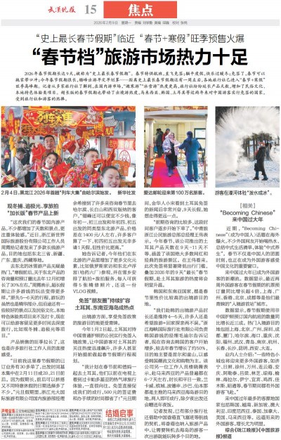 2026年春节假期长达9天,被称为“史上最长春节假期”。春节特供航班,直飞免签;躺平度假,快乐过暖冬;免签了,春节可以拖家带口冲;今年春节假期很长,错峰出游早定早划算……距离史上最长春节假期还有一周左右,各地旅行社已进入“春节+寒假”旺季高峰期。记者从多家旅行社了解到,在国内游市场,“避寒游”“冰雪游”热度更高,旅行社纷纷延长产品天数,增加了民俗文化、本地特色体验类项目。超长版的春节假期也带动了出境游热度,马来西亚、韩国、土耳其等近两年来对中国游客实行免签的国家,受到旅行社和游客的热捧。