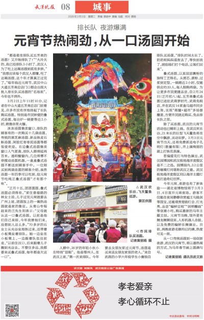 “正月十五,团团圆圆,叠式汤圆必须得有。”家住香港路的林女士说,儿子过完元宵就要去广州上班,团圆饭上的一碗热汤圆就是家的象征。从青山专程赶来的兰先生则表示:“父母就认这一口叠式汤圆。以前是他们自己来排,今年我替他们来,没想到人这么多。”70多岁的石女士从光谷坐地铁过来,还带着小板凳坐着排队。她一边坐在小板凳上,一边跟着队伍往前走,“以前住汉口,后来跟着儿子搬到光谷去。不管住多远,我都要来买叠式汤圆,每年都是欠这一口”。