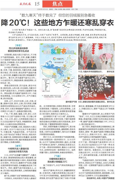 3月气温起伏不定,天气忽冷忽热,又到了“乱穿衣”的季节。本周前期,我国大部偏暖,甘肃、新疆、重庆等地部分地区最高气温升至20℃上下,暖意融融。不过11日起至15日,受冷空气影响,我国多地将迎来气温“大跳水”,冷暖反差明显,刚脱下的厚外套又要重新穿上。中国天气网特别推出全国乱穿衣地图,看看哪里穿衣乱成谜,哪里添衣别迟疑。