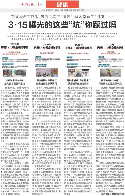 2026年中央广播电视总台3·15晚会播出,曝光的这些问题,可能就藏在你的零食箱、爸妈的养生群,甚至你带孩子去的增高机构里!双氧水漂白的网红鸡爪、号称能“打开骨骺线”的天价增高、专坑老人的虚假健康讲座,以及“三无”外泌体抗衰针……