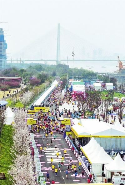来自武汉地区高校的8000多名大学生志愿者,在赛道补给、医疗协助、现场引导等多岗位提供服务。