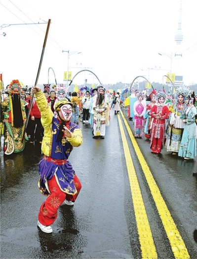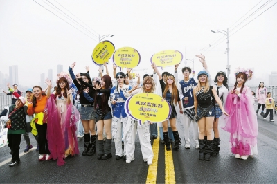 现场,还有来自市直文艺院团、欢乐谷、极地海洋度假区的百人表演方阵,将桥面装点成流动的舞台。欢乐谷的“武汉话动物园”玩偶、“马力全开”运动方队与簪花古风队伍活泼灵动;极地海洋度假区的外籍桑巴与极地舞蹈活力四射;武汉“戏码头”的京剧、汉剧、楚剧名家名角华服巡游,风韵独具。表演者与市民游客热情互动、合影,欢声笑语与江风相和。