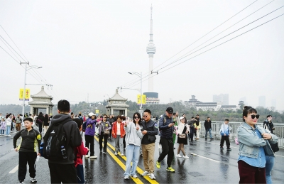 身边没有车辆呼啸,伴着江风用脚步丈量万里长江第一桥。过去一直专属汉马的场景,市民游客今年也体验到了。3月22日上午9点,当汉马选手跑过大桥后,2026“跟着汉马走大桥 ‘花点’时间游武汉”定向游活动在长江大桥上接续火热,数千名市民游客、旅游团队和表演方阵,用脚步亲身丈量这座大桥,感受“最武汉”的城市专属风景。