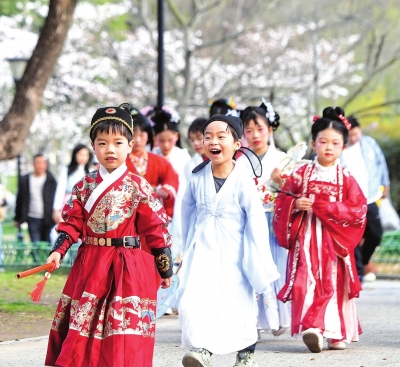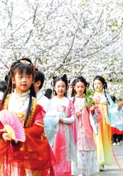 春风送暖,百花争妍。作为2026年央视春晚创意秀《贺花神》的线下延伸,3月22日下午,“十二小花神·踏春行”国风巡游在武汉堤角公园唯美上演,12名孩童身着定制花神服饰,对应十二个月份花卉,在南门与闻风阁湖畔巡游互动,或执花枝,或捧花篮,以童趣与古韵交织的姿态重现传统花节的浪漫生机。此时园内春意正浓,中樱进入盛花期,20公顷园区移步换景,南门百米樱花夹道如云,闻风阁旁杏花与阳光樱相映成趣,古意盎然,巡游队伍穿行其间宛若从画中走来,引得众多市民游客纷纷驻足观赏、拍照留念。