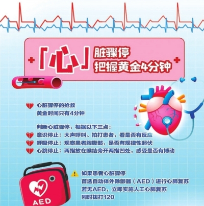 据国家心血管病中心统计数据,我国每年心源性猝死者高达50多万人。如果在1分钟内实施心肺复苏,3至5分钟内进行AED(自动体外除颤器)除颤,可使心脏骤停患者存活率达到50%—70%。