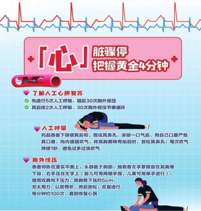 陆远强表示,抓住“黄金4分钟”、掌握救助方法尤为关键。例如施救者拨打120后,可通过拍、喊、摸、看四个步骤判断患者是否有意识、有心跳、有呼吸,通过胸外按压、人工呼吸进行心肺复苏。同时查询附近有无AED,正确使用AED进行急救。