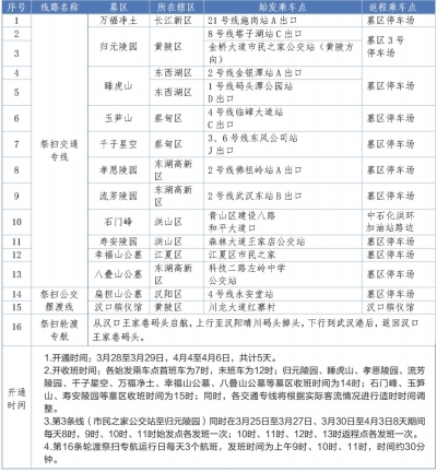 同时,市民之家公交站至归元陵园专线已启动,3月25日—27日、3月30日至4月3日,每天8时、9时、10时、11时始发点各发班一次;10时、11时、12时、13时返程点各发班一次。上述各交通专线运营时间和班次将根据实际客流情况进行适时合理调整。