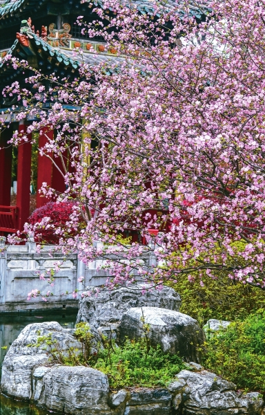 在武汉园博园,垂丝海棠细长的花梗垂下串串粉嫩,与古朴的石阶相映成趣。木兰云雾山的野生杜鹃花以映山红为主,依托不同海拔形成的立体气候,梯次开放,赏花期长达一个半月,目前花宇山与花海已经进入盛花期。