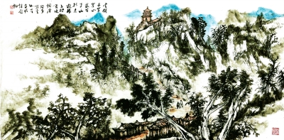释文:云锁千峰翠,山藏古寺幽。行来樵径上,村舍晚烟浮。 作者:徐谷春(67岁)