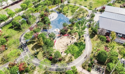 项目工作人员介绍,扩建后的公园绿地总面积达21443平方米,规划采用“一环三景”的空间布局。其中,“一环”指全长350米的健身绿道,与活水公园主园区无缝衔接,形成完整的慢行系统;“三景”分别为入口广场、阳光剧场和运动天地。