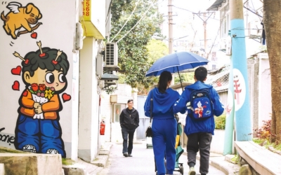 从地铁5号线彭刘杨站出站,沿街巷漫步,大草坪、“我爱武汉”艺术装置等景观节点,都能将黄鹤楼与老街风情完美融合。在先贤街、鹤井路,一条长达300余米的“花香长廊”蜿蜒曲折,月季、绣球、南天竹等花卉争奇斗艳。社区邀请专业艺术团队,在老旧墙面上绘制了充满趣味的卡通彩绘,让斑驳的老墙焕发出新的生机。