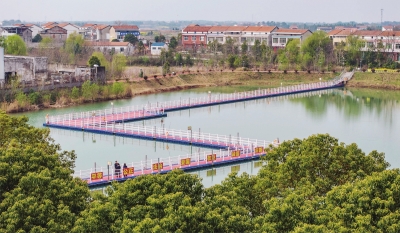 沿着水库步行,记者注意到一座色彩绚丽的浮桥横跨水面,几名村民正在桥上悠然散步。据潘塘街道城管办主任谢文胜介绍,这座全长284米、宽3米的“彩虹浮桥”,已然成为当地村民休闲健身的热门打卡地。整个项目在规划之初就充分考虑了村民的实际需求:2.3公里的环湖绿道蜿蜒环绕,浮桥与绿道相得益彰;采用新型透水混凝土铺设的休闲步道,既解决了雨天积水问题,又避免了扬尘困扰;水库两岸遍植花草树木,配套建设的公共厕所和停车场也为居民提供了诸多便利。