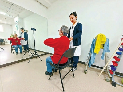 “手臂上举,注意呼吸……”上周四9时许,在北京朝阳劲松社区卫生服务中心一楼的运动处方室内,四位老人正缓缓举起弹力带。中心主管护师李颖在一旁指导,密切关注每个人的动作细节。当社区居民吴慧珍缓缓抬臂后,李颖轻声提醒:“阿姨,肩膀放松,不要耸肩。”吴慧珍随即微调动作。