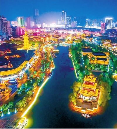 春日晚间,漫步于淮安闹市区的里运河畔,灯光勾勒出运河水的柔美,游船来回穿梭,岸边商铺林立,三三两两的市民游客悠闲地逛街散步。