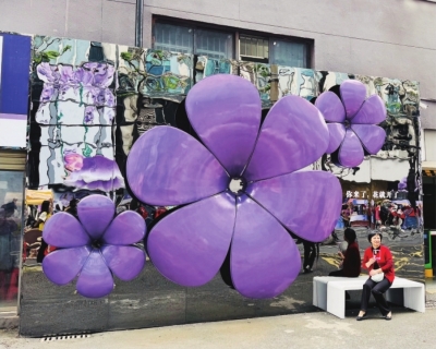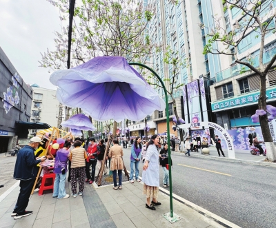 除了自然美景,街区还融入了“泡桐花”主题元素。从彩色墙绘到景观座椅,从氛围路灯到特色装饰,处处可见紫色点缀。位于路口的一家商超外墙被精心绘制上大幅泡桐花图案,引得不少居民争相合影。