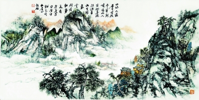 释文:层峰破雾开新境,近水人家纳万源。得此青山生瑞气,云程发轫势长存。