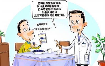 适量食用蓝莓确实对于控制慢性低度炎症、心血管疾病等有一定的辅助作用,但是花青素在肠道中的吸收有限,当人体出现细菌、病毒感染引发的急性炎症时,绝不能用蓝莓代替消炎药治疗。