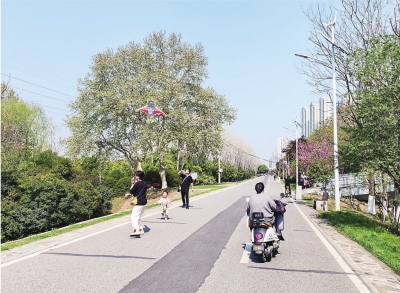 4月1日上午,天清气爽。张公堤绿道三金潭入口,唐女士身穿一身时尚精致的骑行服,俯身跨上公路自行车,轻巧地跃上堤顶,接下来她要完成20公里的骑行。车轮飞转带起坠落的花瓣,堤边公园里,有老人在树下打太极;绿道上,年轻的妈妈正带着孩子放风筝。